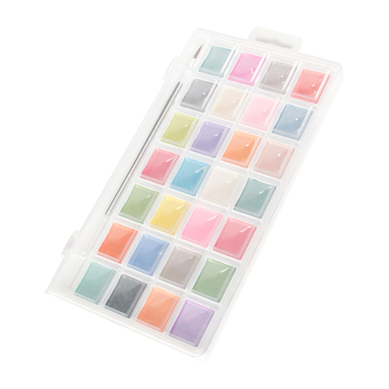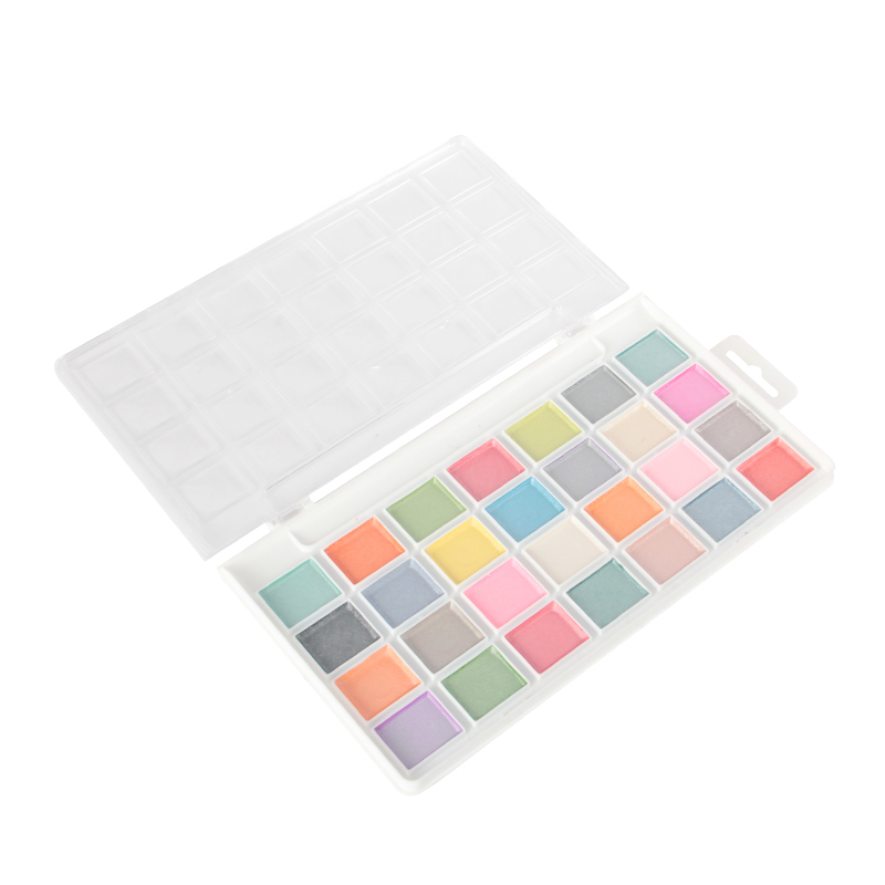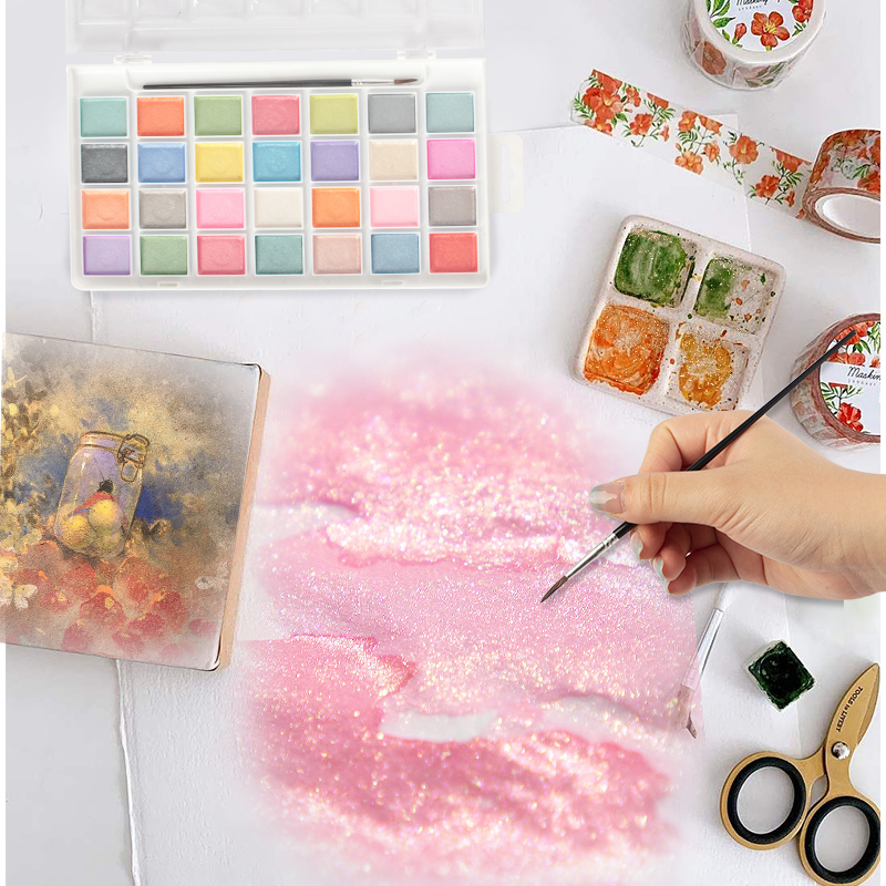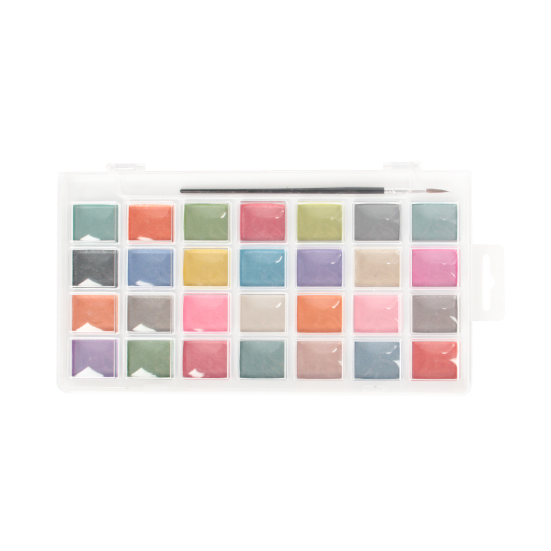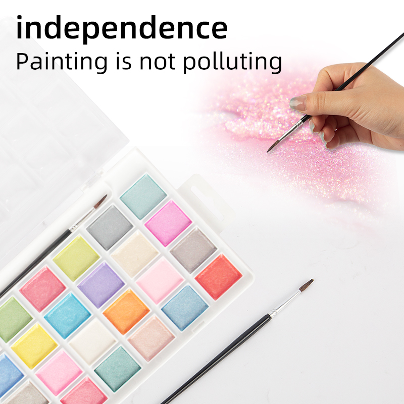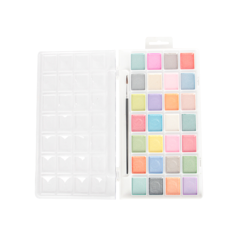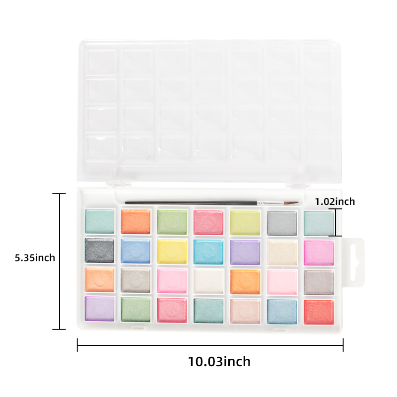 Chang Xiang Solid professionelt premium akvarelfarvesæt har 28 forskellige livlige farver, inklusive 28 glitterfarver, og kommer med en akvarelpensel. Hver glitterfarveblok i dette metalliske akvarelsæt er omhyggeligt håndlavet og forblandet med iriserende medium. Disse akvareller er lavet af ekstra fine og rene pigmenter og udviser høj mætning og lysægthed.
