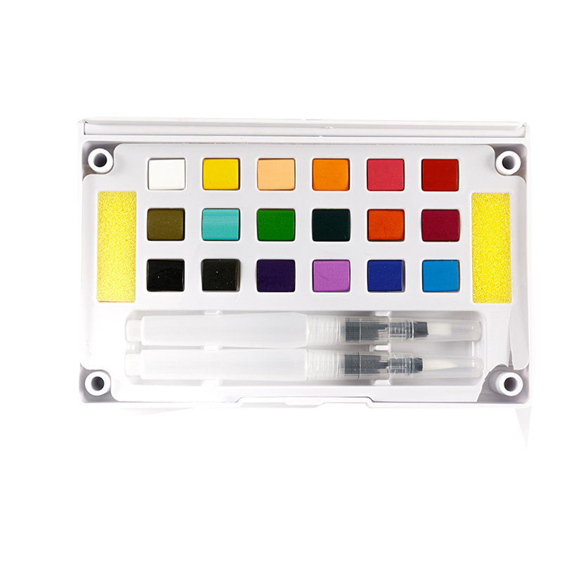 Dette er et akvarelrejsesæt af høj kvalitet. Det inkluderer de 18 mest almindelige farver og børster, som du skal bruge for at udforske din kreativitet i akvarel! Sættet leveres med en bærbar palette til nem blanding, samt en kunstners penselpen til at omridse og skabe mere præcise farveområder. Og selvfølgelig er der to pensler til at dyppe i din maling og blande på paletten